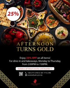 Enjoy 25% OFF on all items! For dine-in and takeaways, Monday to Thursday, from 2:00PM to 7:00PM. Available at all Tarbush branches until December 11